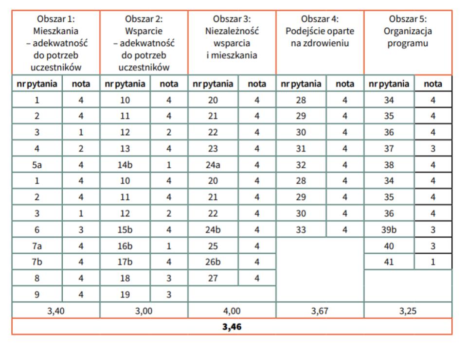 Uzyskana nota oznacza, że realizowany program ma tylko nieznacznie niższą ocenę wierności od poziomu oznaczającego wysoką wierność NM według standardów międzynarodowych. W badaniu wierności dziesięciu programów NM na świecie opublikowanym w „European Journal of Homelessness Vol. 12, Issue 3 – Special Edition on Fidelity to the Housing First Model (FEANTSA, 2013) noty powyżej 3,50 uznawano za oznaczające wysoką wierność, poniżej 3 – niską wierność (Założenie to dotyczy not uzyskiwanych w badaniu wierności ze skalą z 2013 roku (Stefancic, Tsemberis).